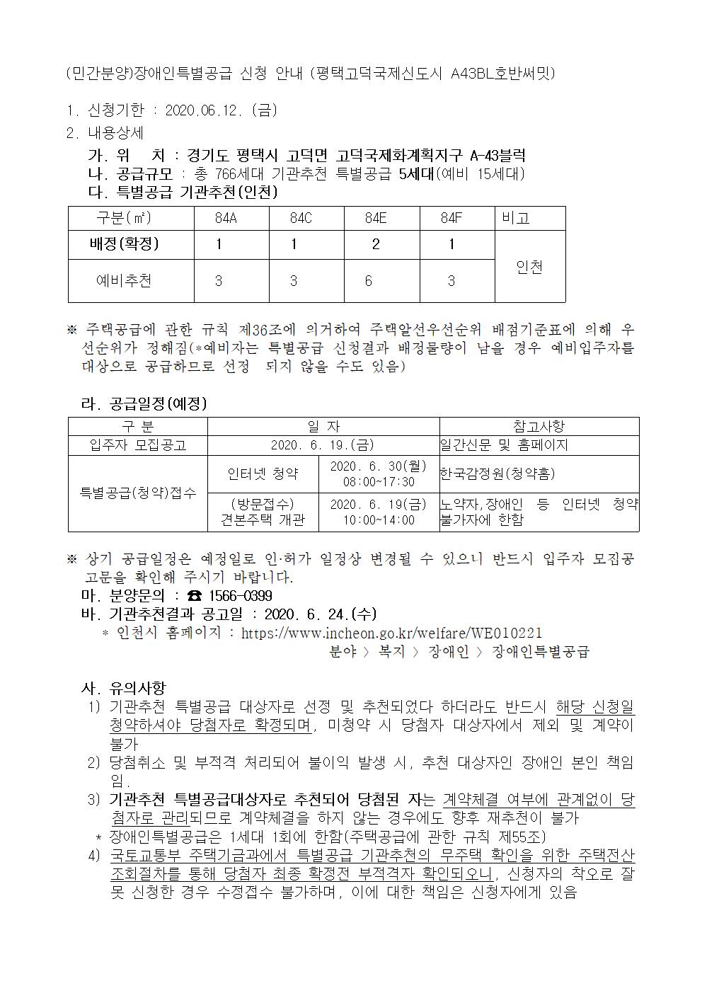 (민간분양)장애인특별공급 신청 안내(평택고덕국제신도시 A43BL호반써밋)