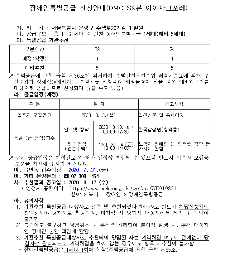 장애인특별공급 신청 안내(DMC SK뷰 아이파크포레)