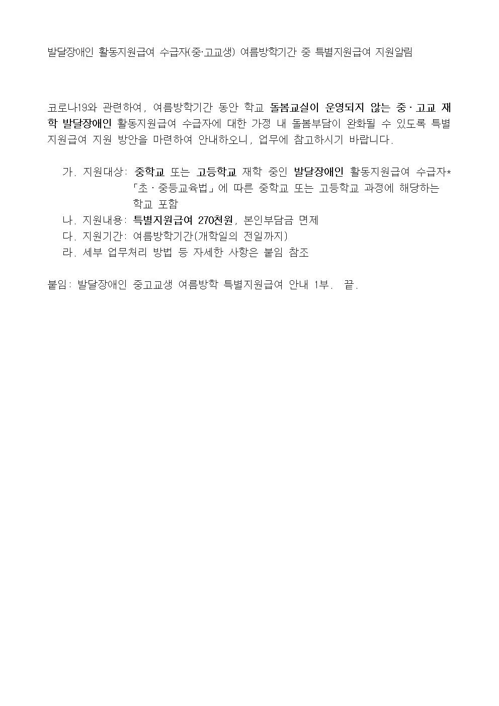발달장애인 활동지원급여 수급자(중·고교생) 여름방학기간 중 특별지원급여 지원알림