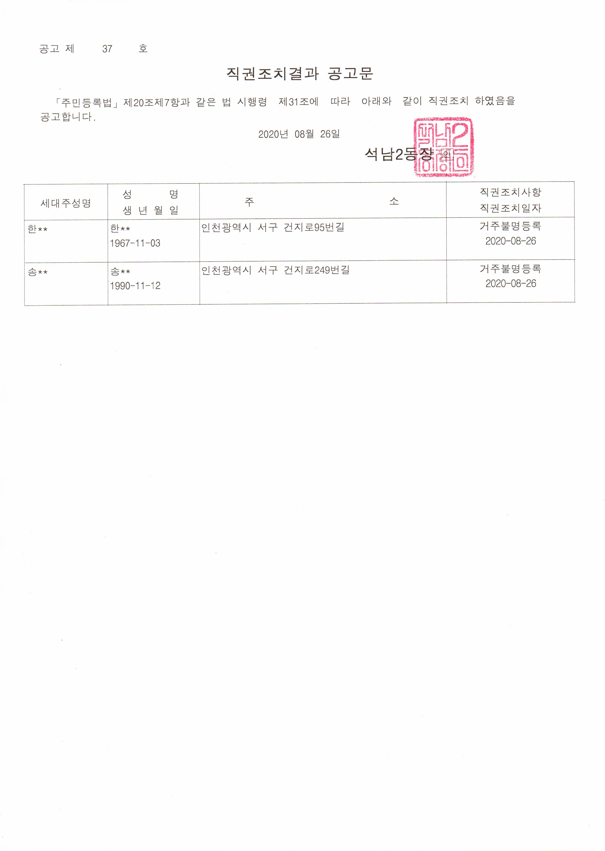 주민등록법 제20조 제7항과 같은 법 시행령 제31조에 따라, 거주불명등록 후 1년이 경과한 자에 대하여 아래와 같이 직권조치(행정상 관리주소이전)하였음을 공고합니다.