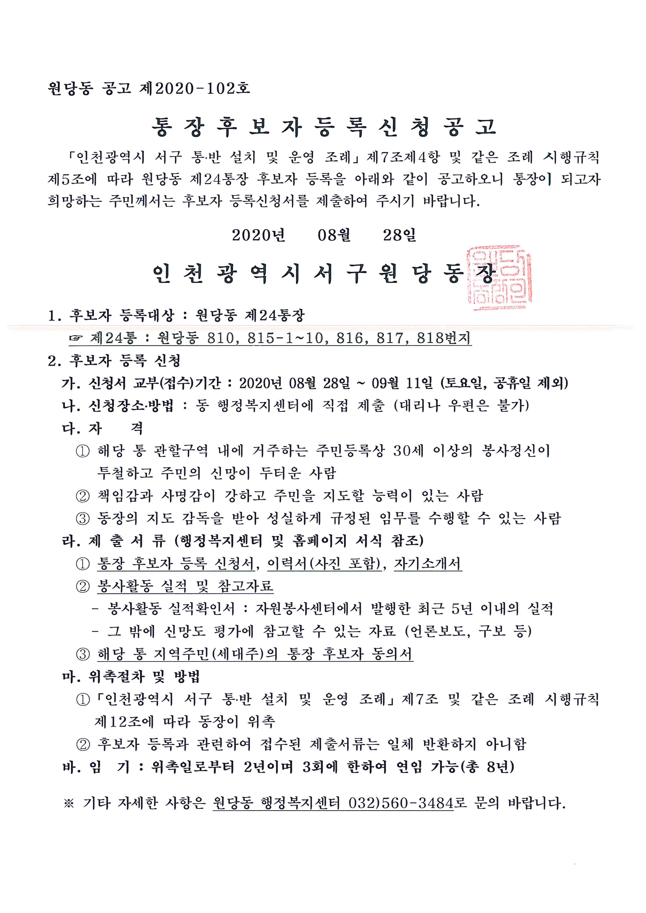 「인천광역시 서구 통·반 설치 및 운영 조례」 제7조 제4항 및 같은 조례 시행규칙 제5조의 규정에 의거 원당동 제24통장 후보자 등록을 붙임과 같이 재공고합니다.