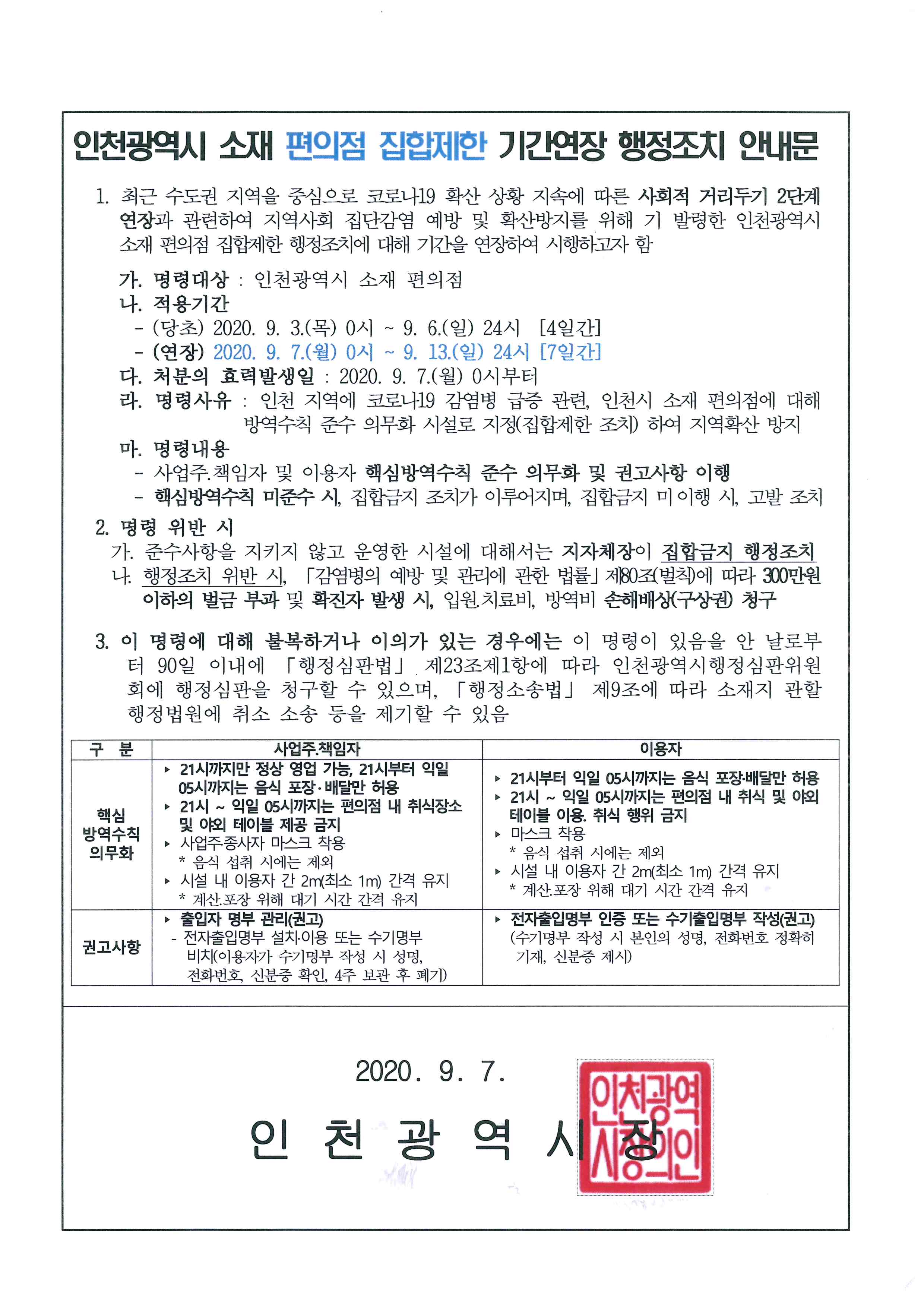 인천광역시 소재 편의점 집합제한 기간연장 행정조치 시행 알림