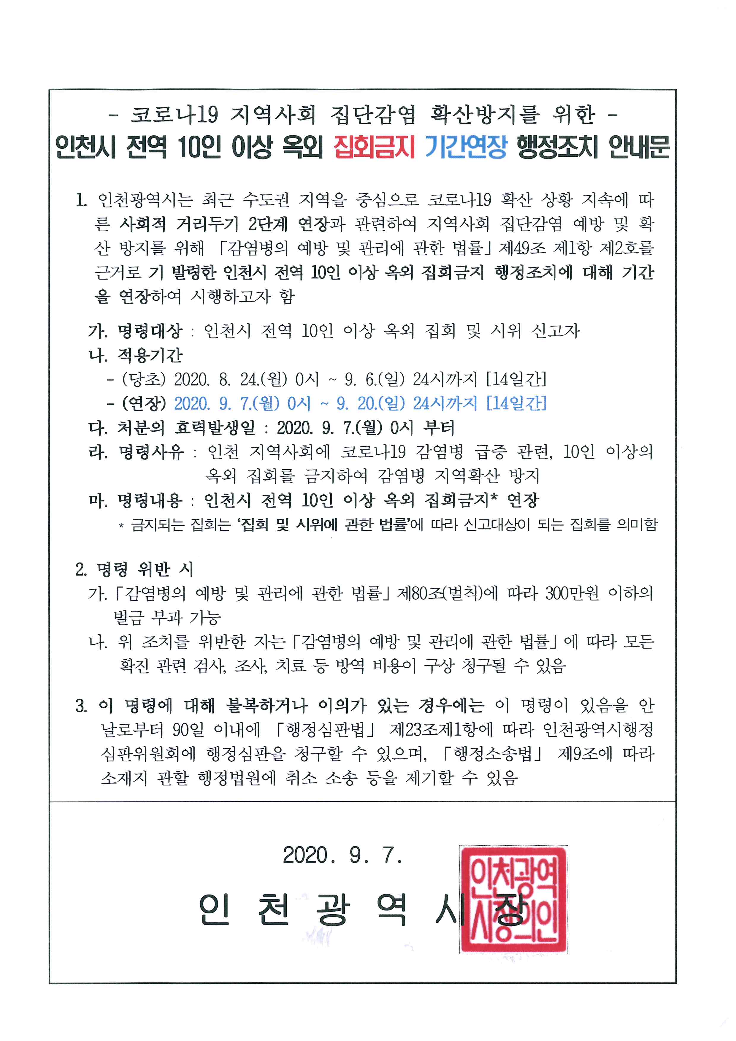 인천광역시 전역 10인 이상 옥외 집회금지 기간연장 행정조치 시행 알림