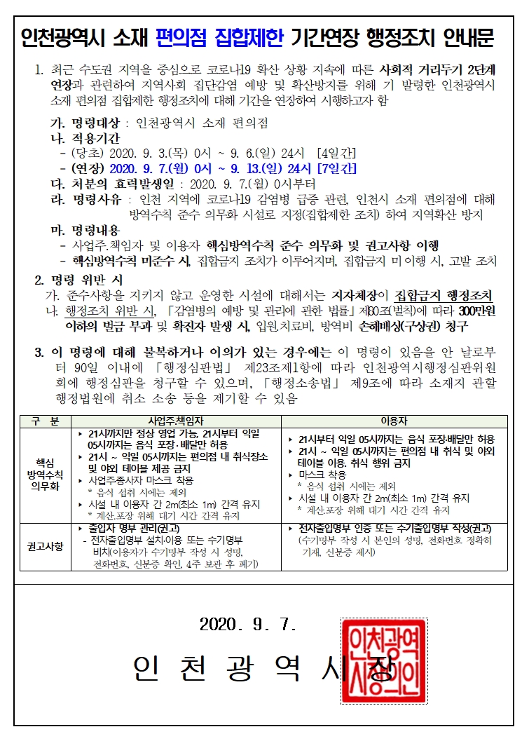 인천광역시 소재 편의점 집합제한 기간연장(~2020.09.13.)
