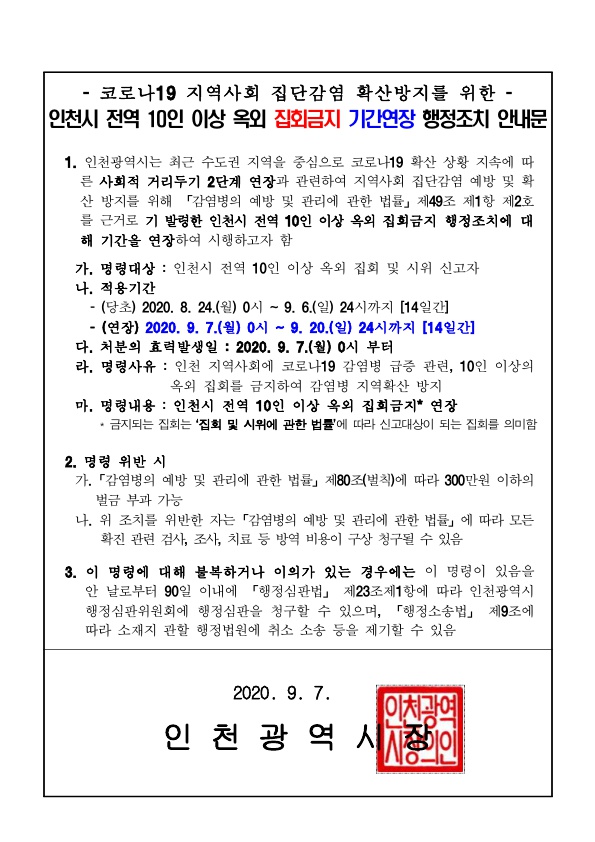 인천공역시 전역 10인 이상 옥외 집회금지 기간연장 알림 (~2020.09.20.)