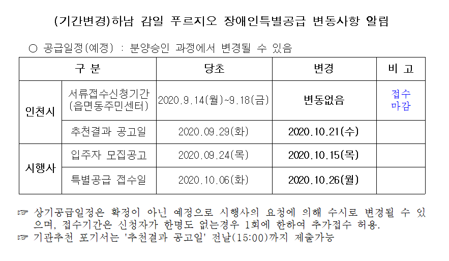 (기간변경)하남 감일 푸르지오 장애인특별공급 변동사항 알림