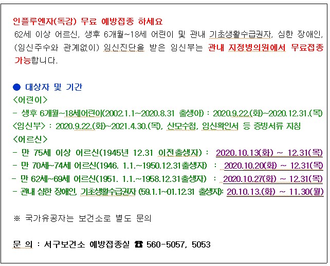 2020년 인플루엔자(독감) 무료 예방접종 안내