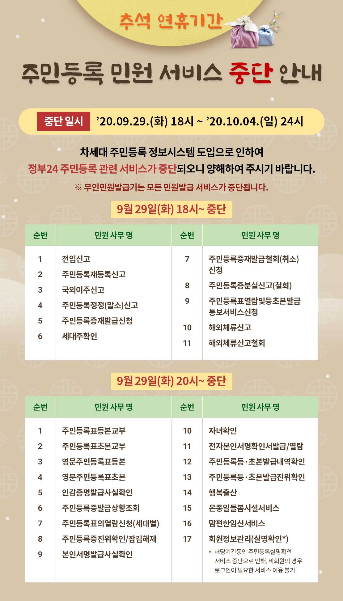 추석 연휴기간 주민등록 민원 서비스 중단 안내(9/29~10/4)
