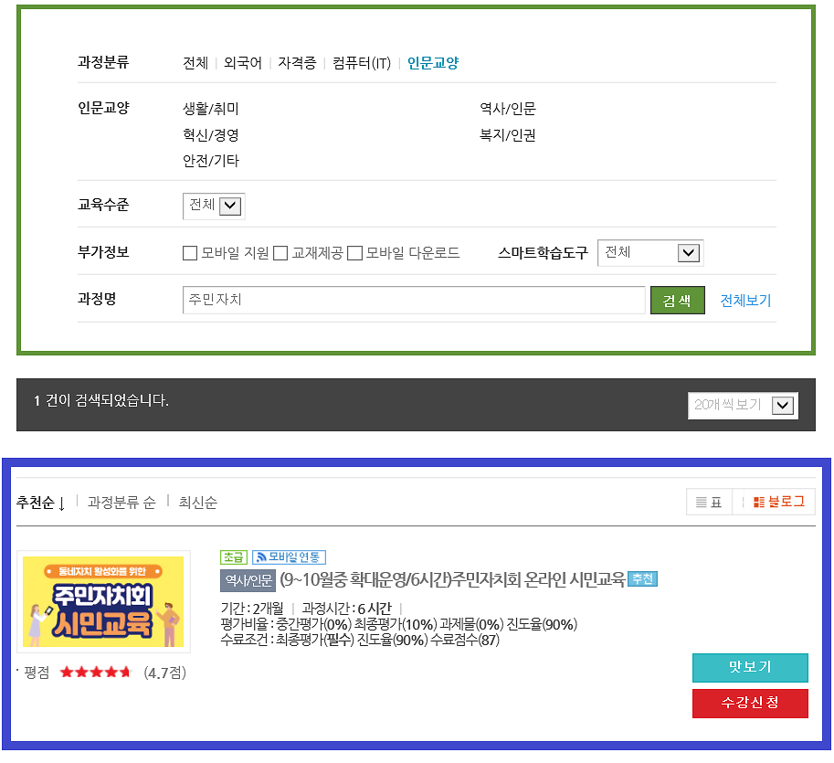 - 인문교양 > 인문교양수강신청 > '주민자치' 검색