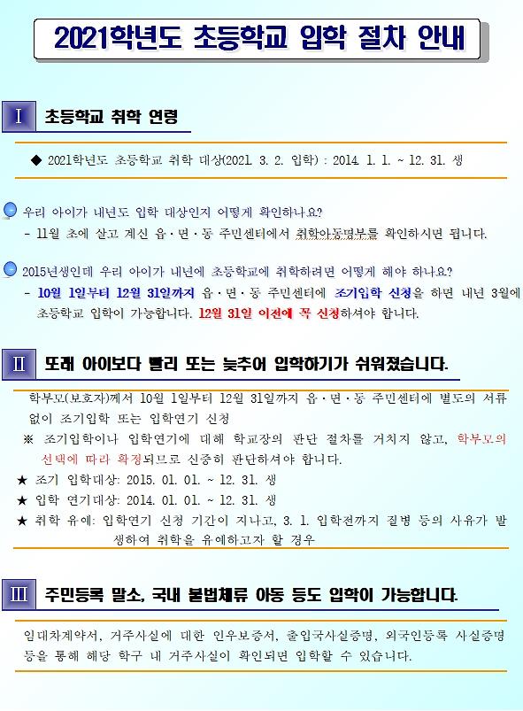 2021학년도 초등학교 입학절차 및 조기입학, 입학연기 신청 안내