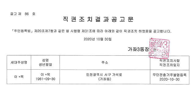 다. 공 고 내 용 : 무단전출 거주불명등록