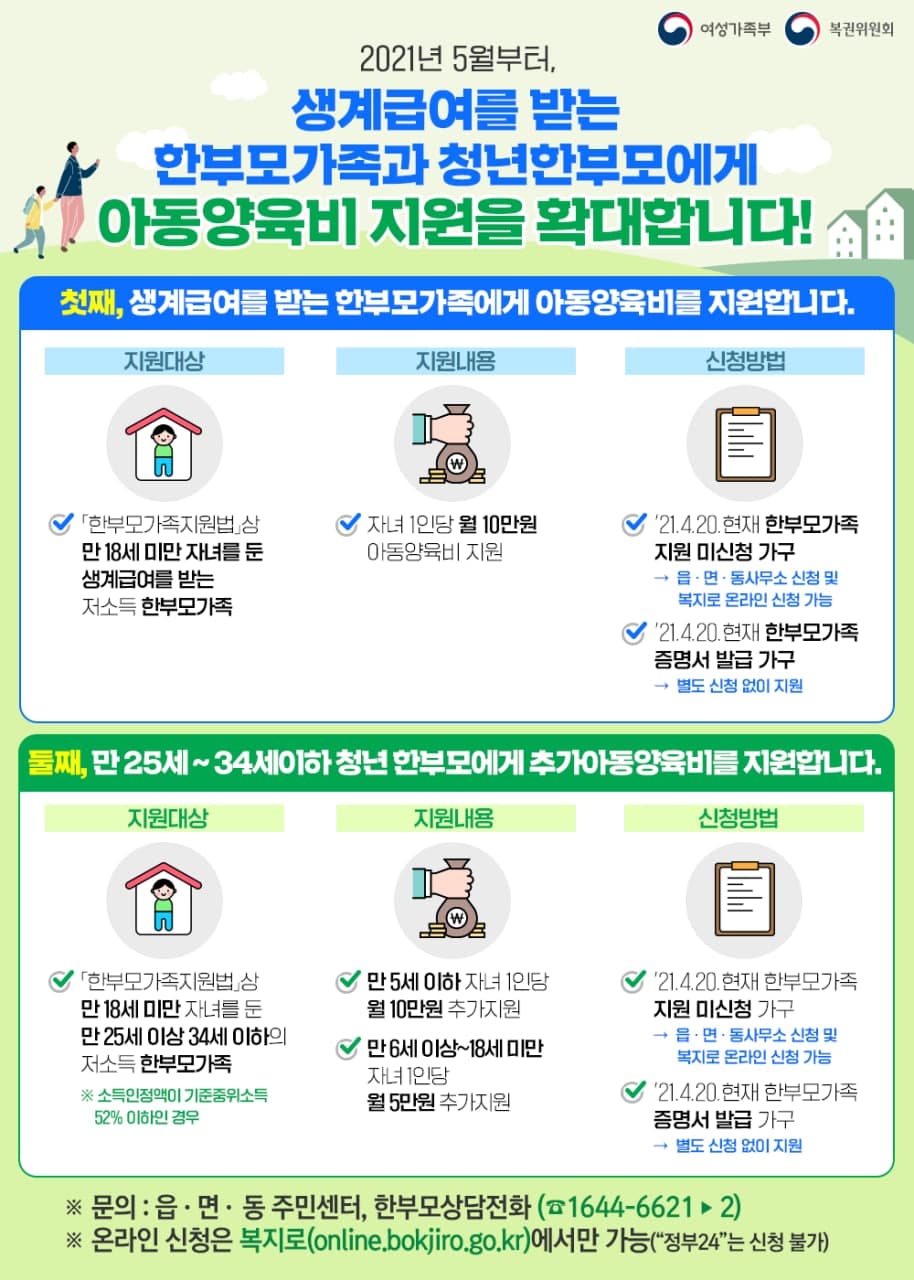 만 25세~34세 이하 청년 한부모까지 추가아동양육비 지원대상 확대 (만 5세 이하: 월10만 / 6세~18세 미만: 월5만) |