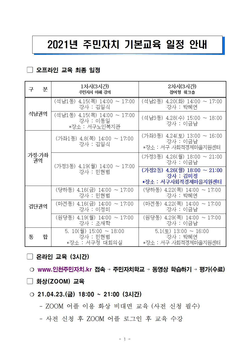 주민자치회 관련 주민자치 기본교육 일정에 변동사항이 있어 최종일정 안내드립니다.