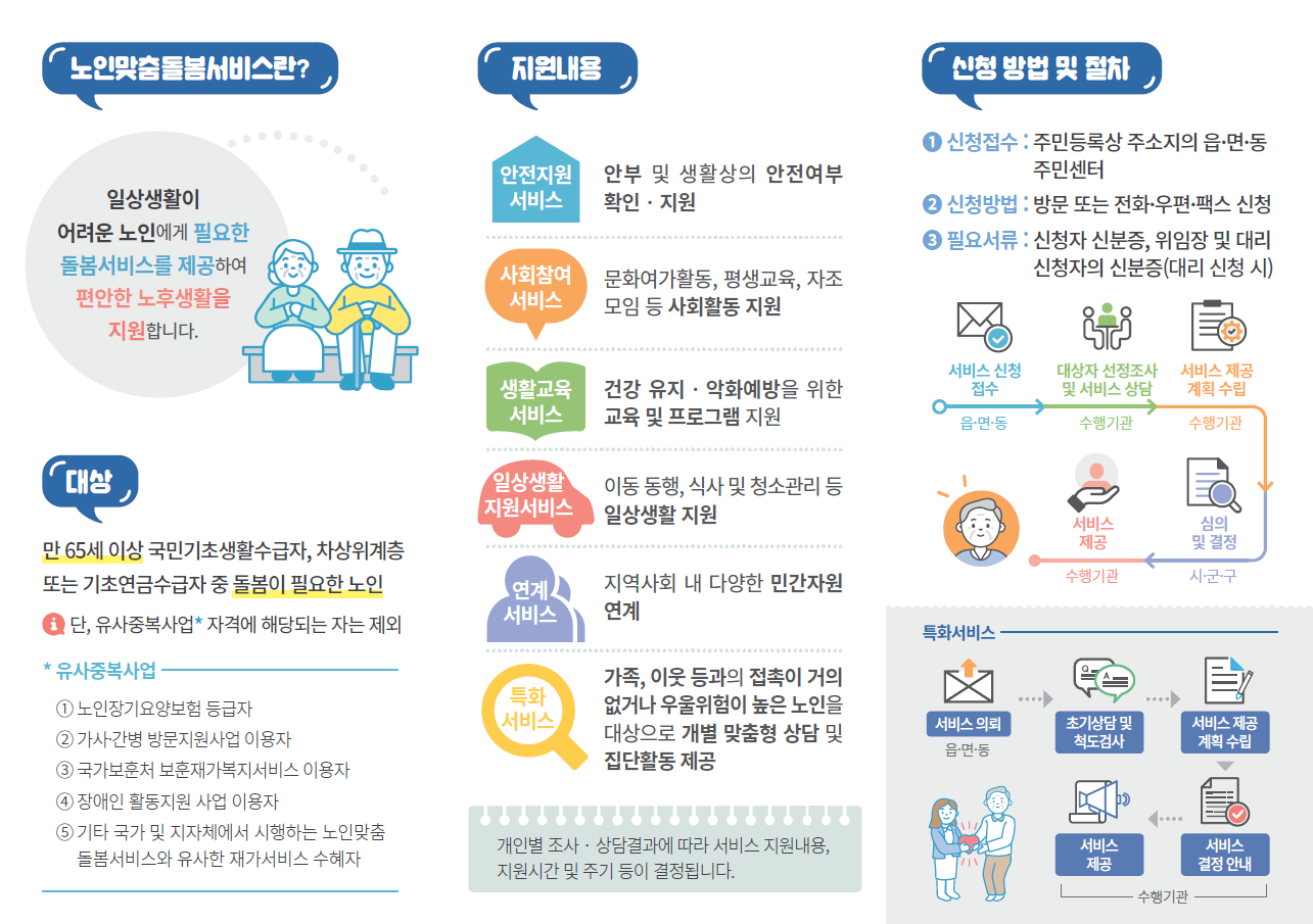 - 대상 : 만65세이상 국민기초생활수급자, 차상위계층 또는 기초연금수급자 중 돌봄이 필요한 노인