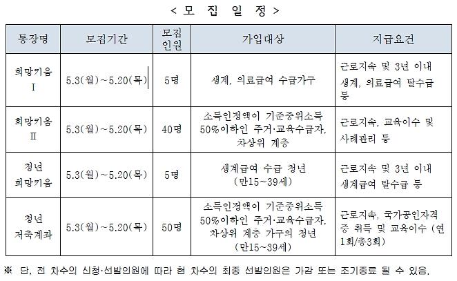 2021년 5월 자산형성지원사업 모집 및 접수일정을 안내하오니 관심있는 주민들께서는 거주지 행정복지센터에 신청하여 주시기 바랍니다.