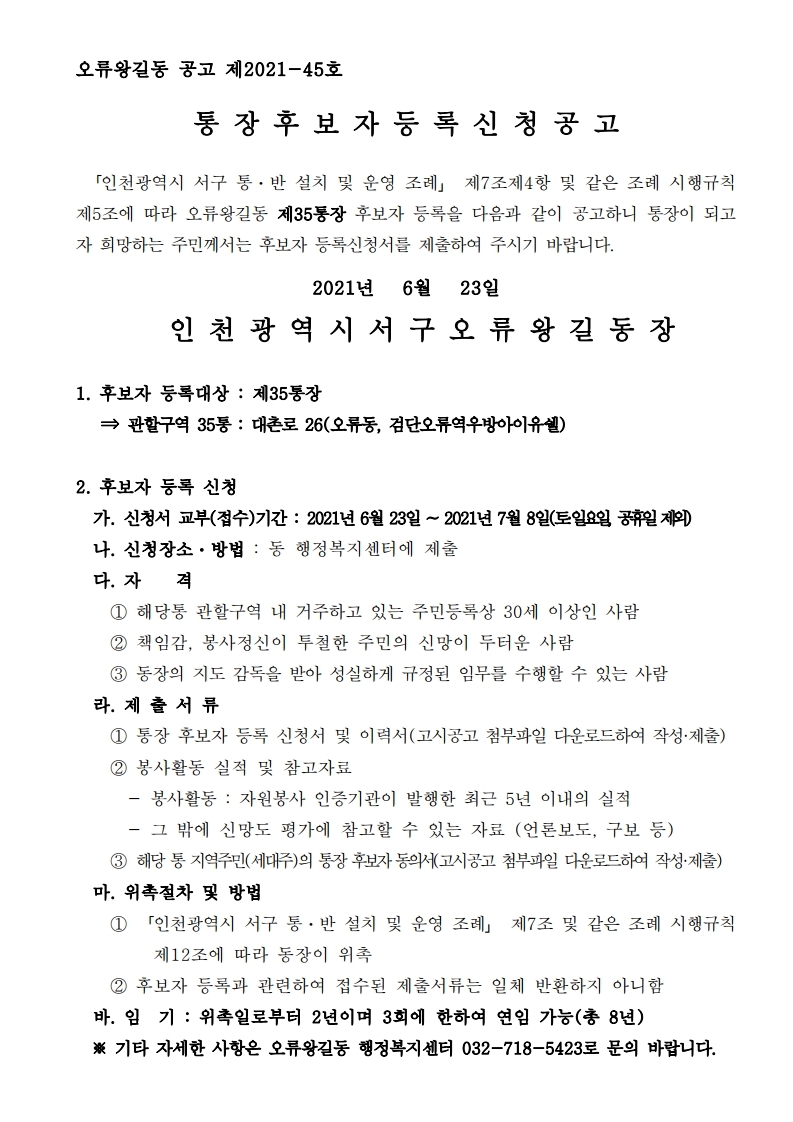 오류왕길동 제35통장 공개모집 공고