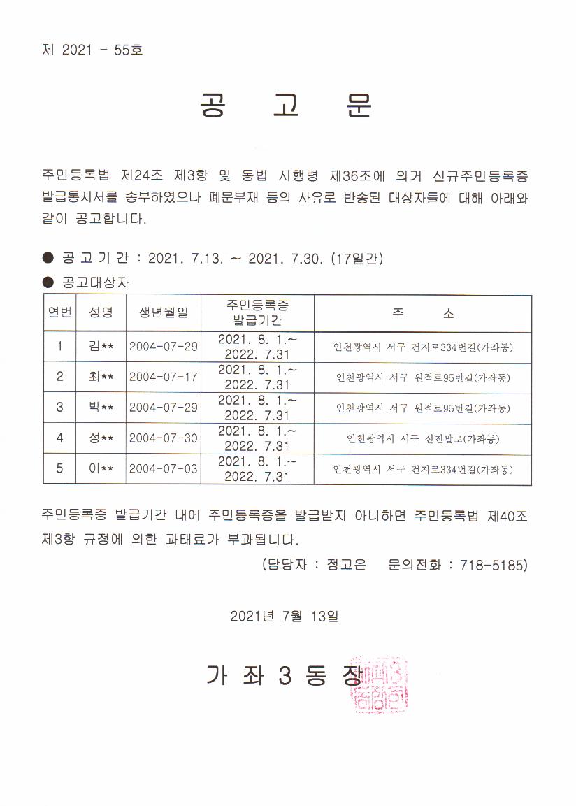 주민등록법 제24조 제3항 및 동법 시행령 제36조에 의거 신규주민등록증 발급 통