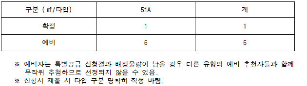 ■ 공급규모 : 확정 1세대, 예비 5세대 (배점기준표에 의해 고득점자 우선순위 부여)