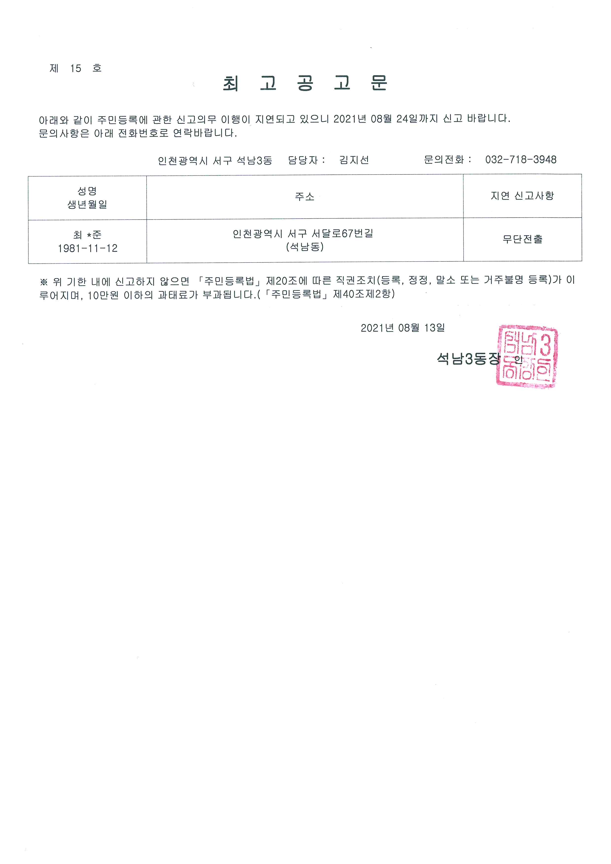 주민등록 무단전출로 판단되는 자에 대하여 최고장을 발송하였으나 기한 내에 신고하지