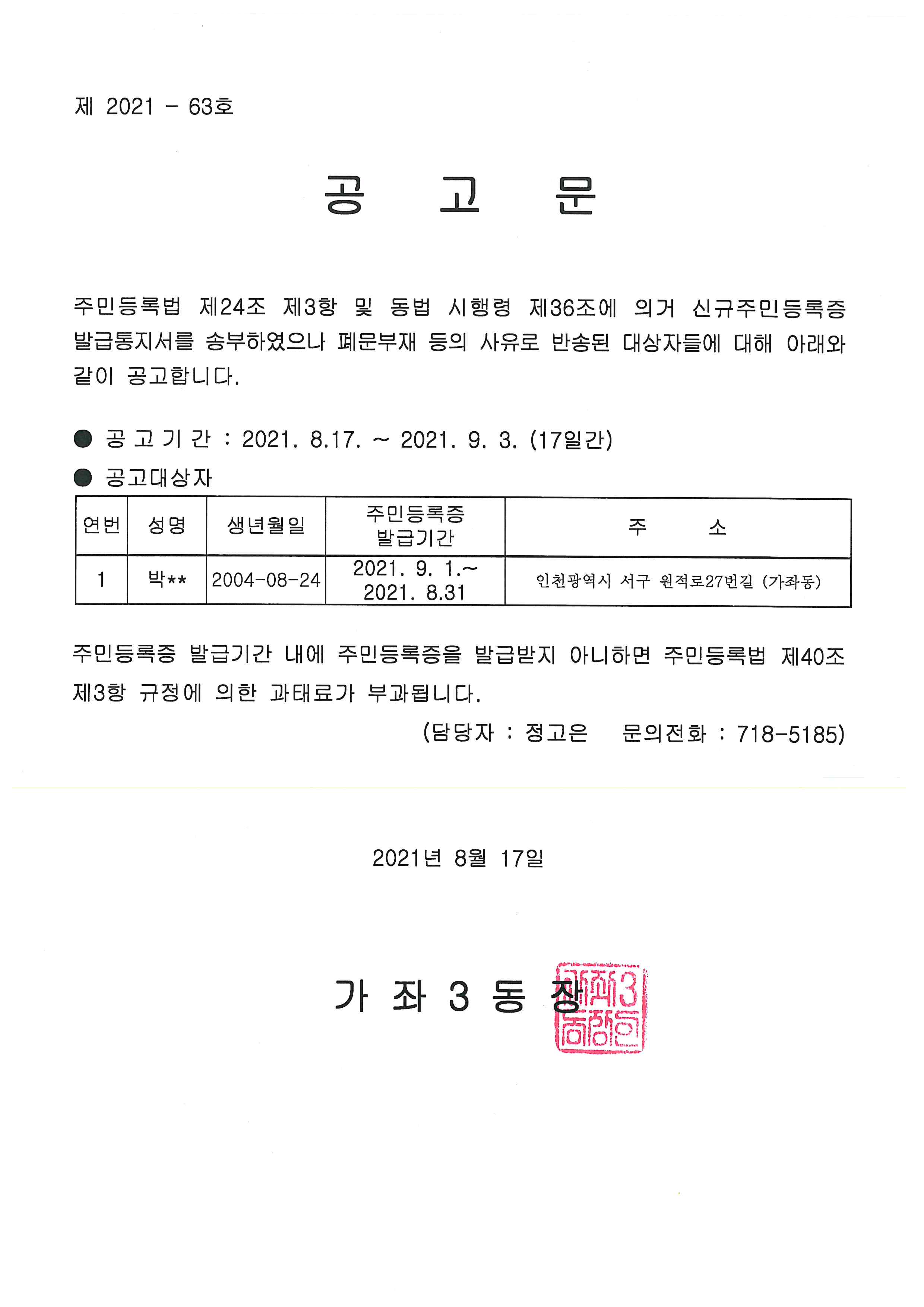 주민등록법 제24조 제3항 및 동법 시행령 제36조에 의거 신규주민등록증 발급 통