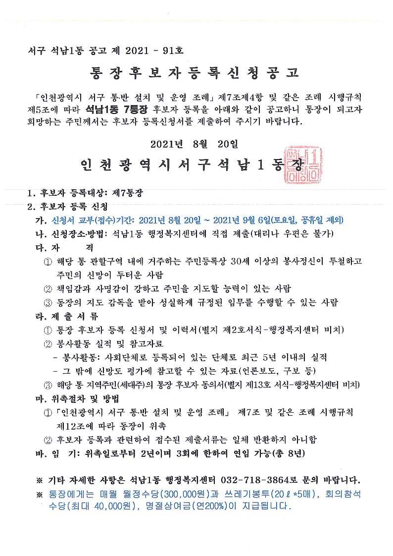 석남1동 제7통장 공개모집 공고를 붙임과 같이 게시하오니