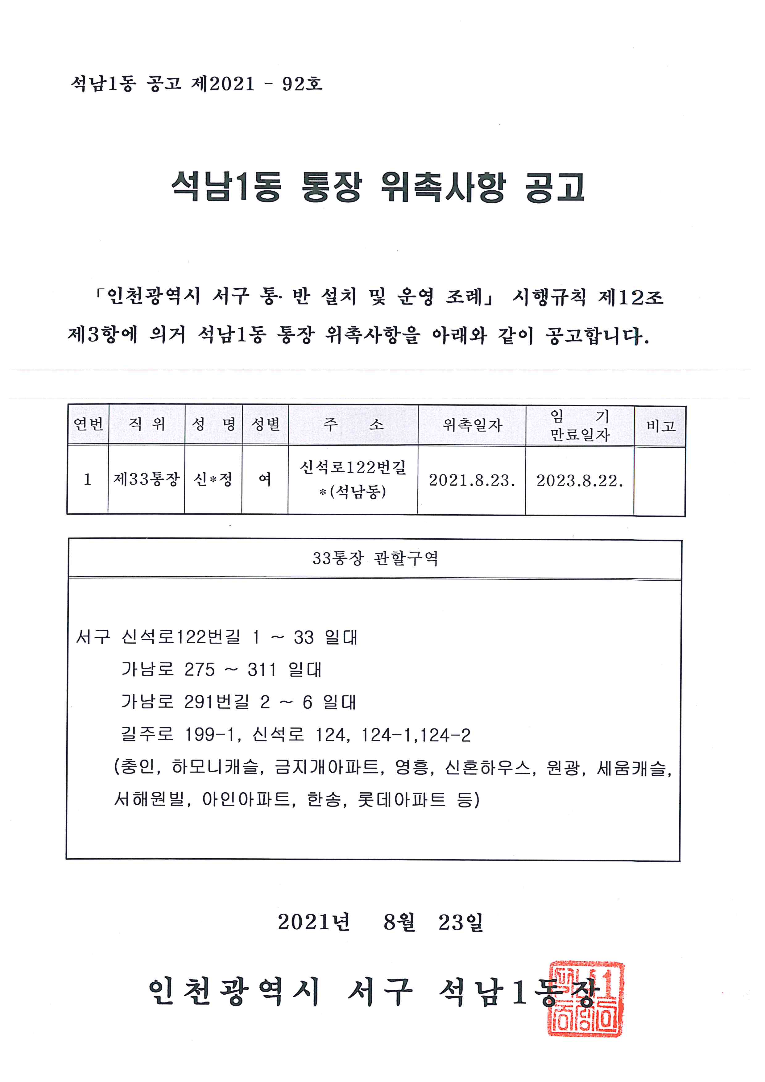 붙임 석남1동 통장 위촉사항 공고(33통) 1부. 끝.