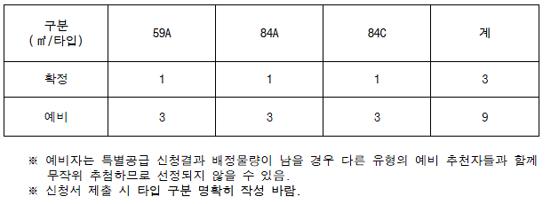 ■ 공급규모 : 확정 3세대, 예비 9세대 (배점기준표에 의해 고득점자 우선순위 부여)