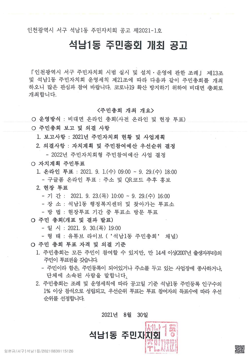 2021년 석남1동 주민총회 개최 및 2022년도 석남1동 주민자치계획(안) 공고