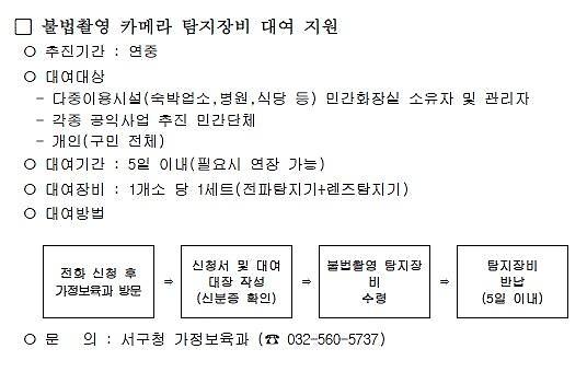 서구에서는 늘어나는 디지털 성폭력 범죄의 근절을 위해 화장실과 같은 공공이용시설에 대하여 불법촬영 카메라를 탐지하는 장비를 무료로 대여해주는 서비스를 시행하고 있습니다. 관련한 내용을 아래과 같이 안내드리오니 많은 이용 바랍니다.