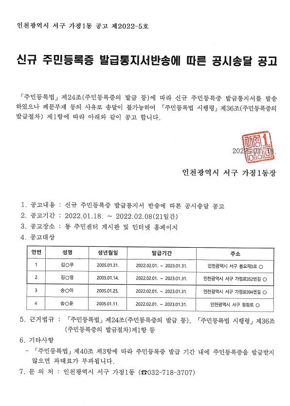 신규 주민등록증 발급통지서반송에 따른 공시송달 공고