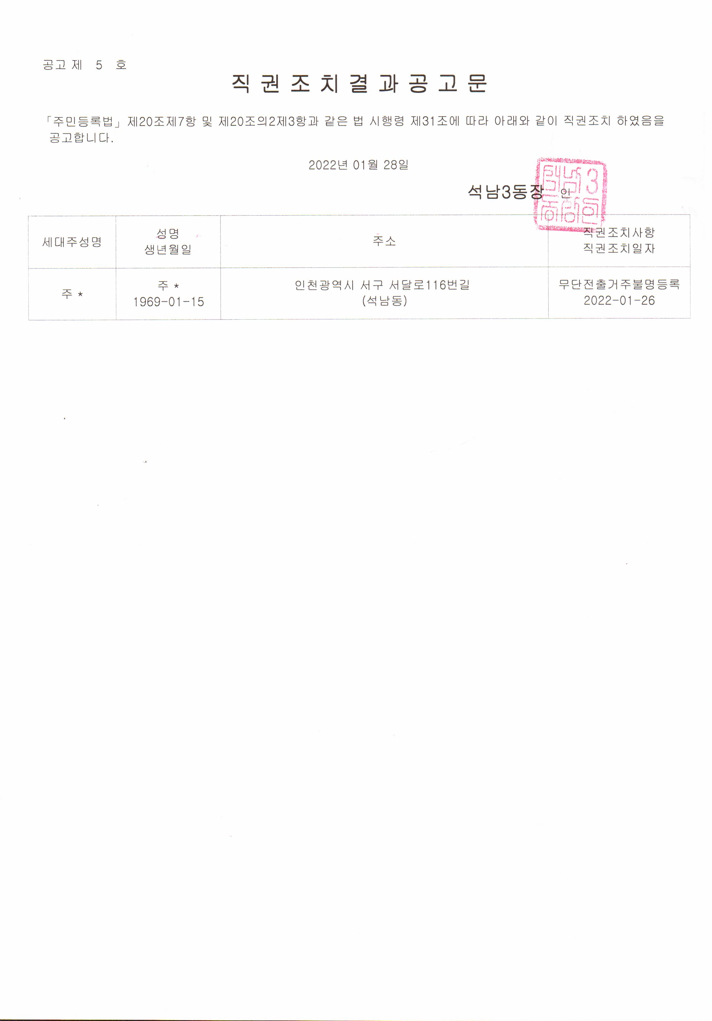 주민등록 무단전출자 직권조치 결과 공고
