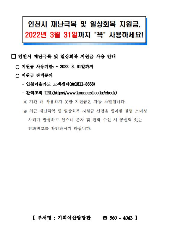 일상회복 지원금(인천시 재난지원금) 사용 기한 안내(~3/31)