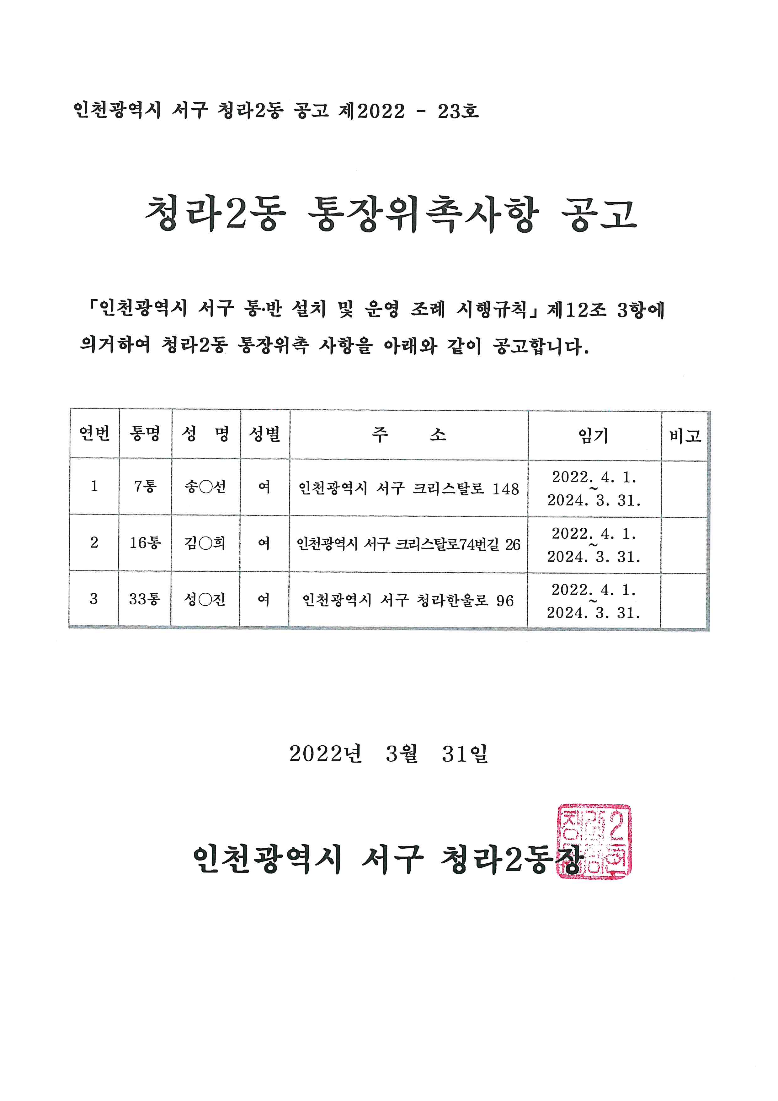 청라2동 통장위촉사항 공고(7, 16, 33통)