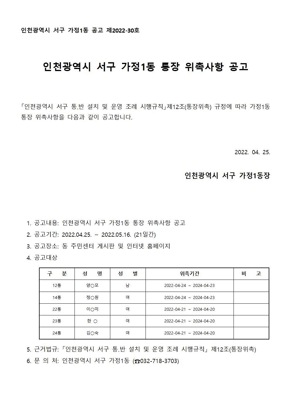 인천광역시 서구 가정1동 통장 위촉사항 공고(12, 14, 22, 23, 24통)