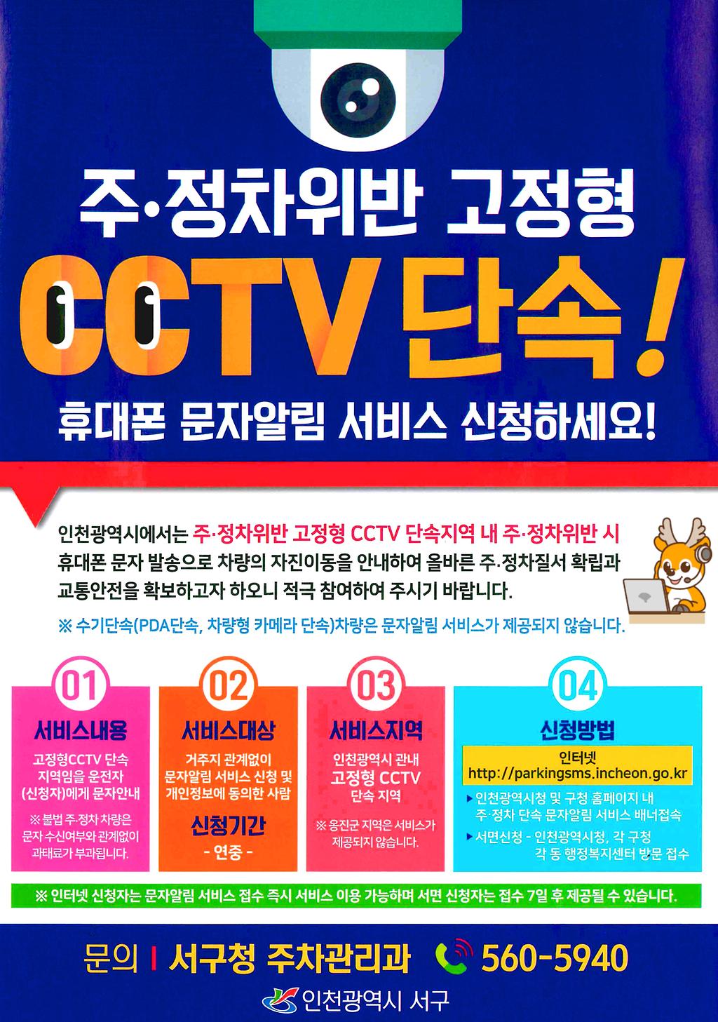 - 불법주정차 고정형 CCTV 1차 단속(촬영) 시 안내문자 발송(옹진군 제외)