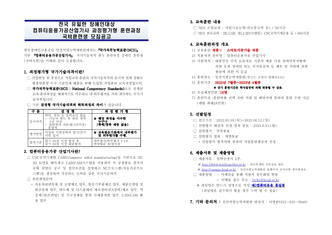 [일산직업능력개발원] 국가기술 취득과정 장애인훈련생 모집 [컴퓨터응용가공산업기사]