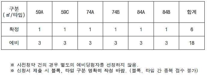 공급규모 :  확정 6세대, 예비 18세대 (배점기준표에 의해 고득점자 우선순위 부여)
