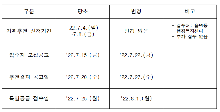 ○ 읍면동 기관추천 신청기간'과 '군구별 명단 제출 일자'는 변동 없음