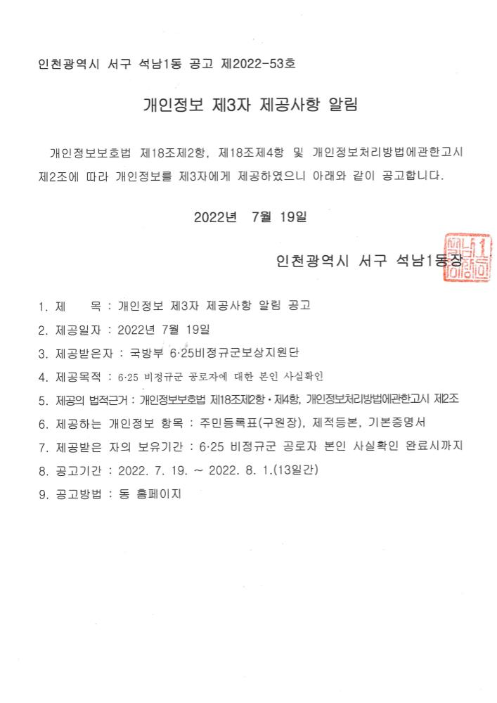 석남1동 행정복지센터에서 보유한 개인정보를 제3자 제공한 내역에 대하여 아래와 같이 게재합니다.