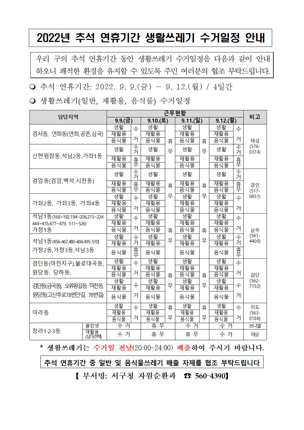 2022년 추석 연휴기간 생활쓰레기 수거일정 안내