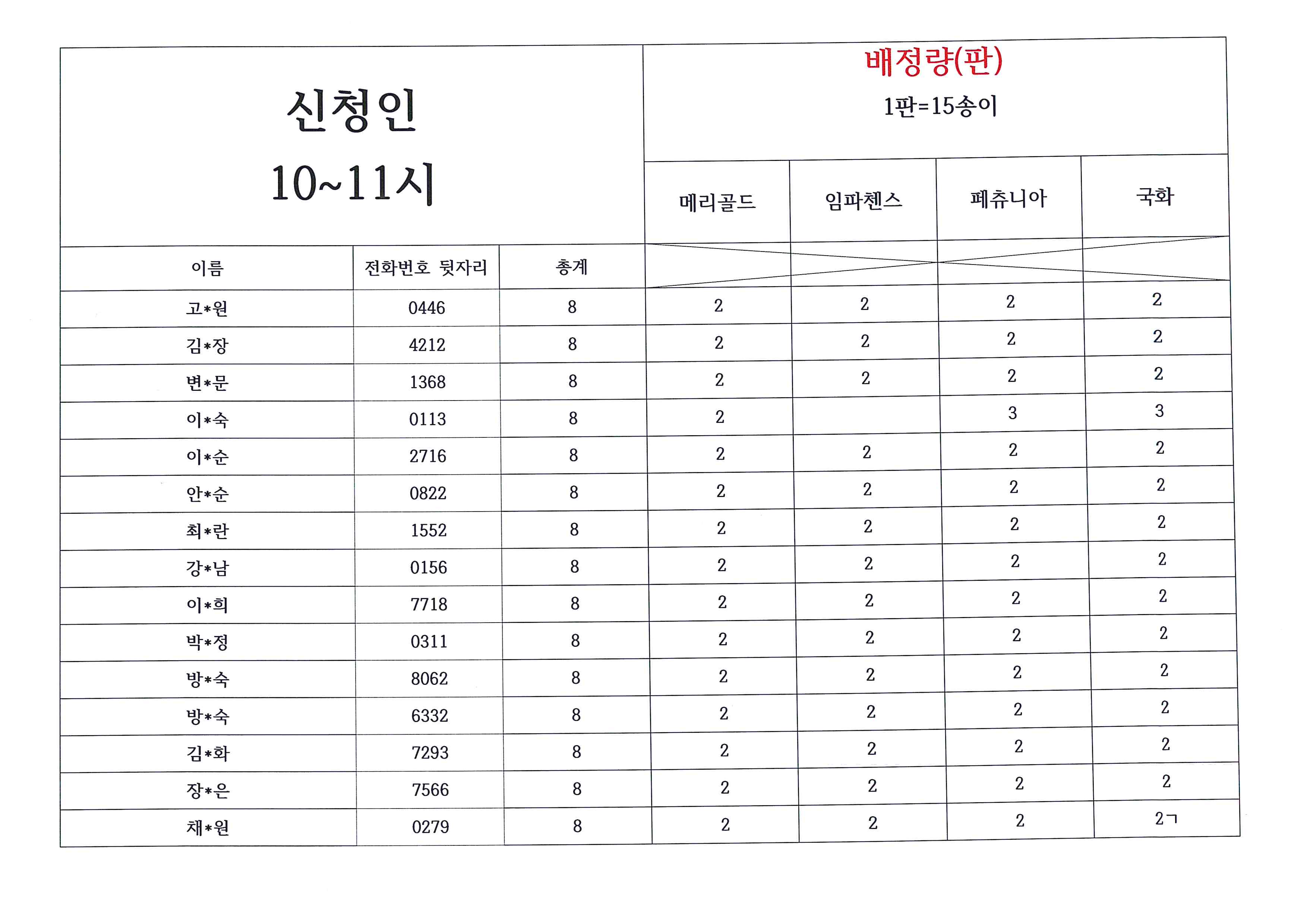 최대한 균등 배부하였으며, 1판당 15송이인점 참고 바랍니다.