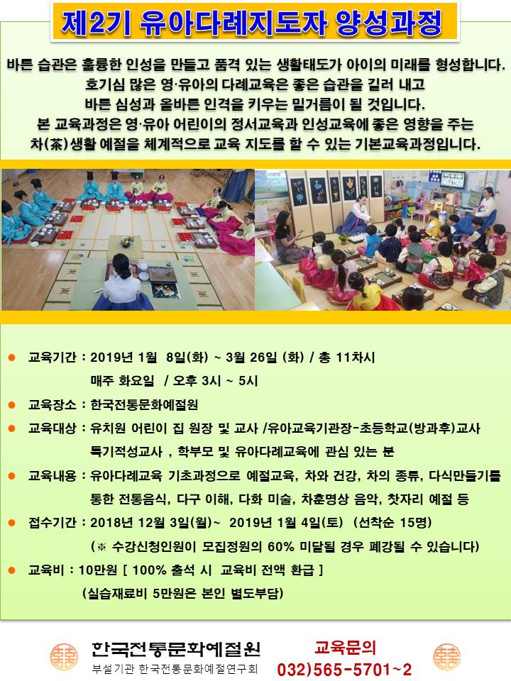안녕하세요. 한국전통문화예절원에서는 사회적공헌 활동의 일환으로 유아다례지도자양성과정 무료교육을 실시하고 있습니다. 바른 습관은 훌륭한 인성을 만들고 품격 있는 생활태도가 아이의 미래를 형성합니다. 호기심이 많은 유아 어린이의 다례교육은 좋은 습관을 길러 내고 바른 심성과 올바른 인격을 키우는 밑거름이 될 것입니다. 본 교육과정은 어린이의정서교육과 인성교육에 좋은 영향을 주는 차(茶)생활예절을 체계적으로 교육 지도할 수 있는 기본교육과정입니다. 많은 선생님과 학부모 및 유아다례교육에 관심이 있는 분들의 참여의 바랍니다. 고맙습니다. 한국전통문화예절원 원장 변영주 배상