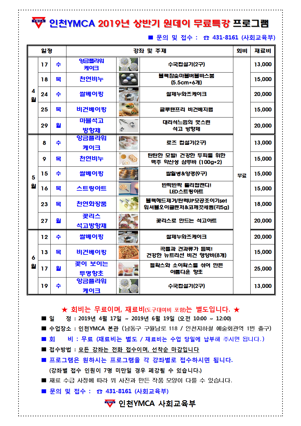 인천YMCA 2019년 원데이 무료특강 프로그램