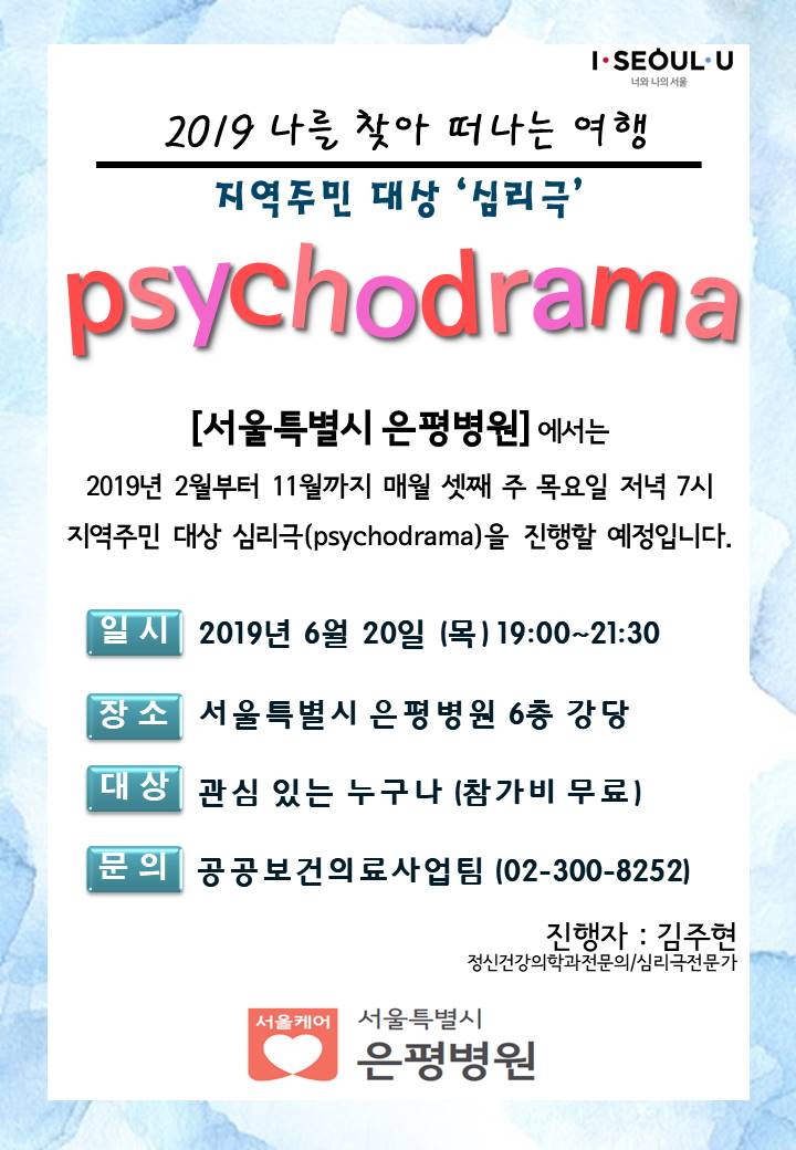 [서울특별시 은평병원]에서 6월 20일(목) 저녁 7시에 무료 심리극이 진행됩니다.