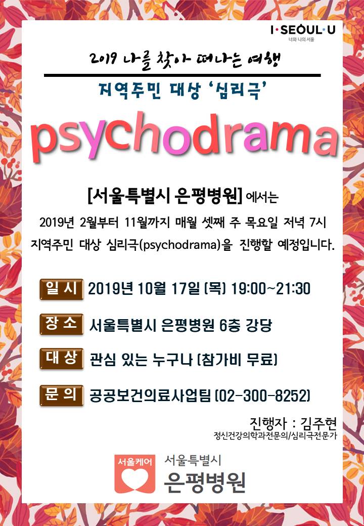 [서울특별시 은평병원]에서 10월 17일(목) 저녁 7시에 무료 심리극이 진행됩니다.