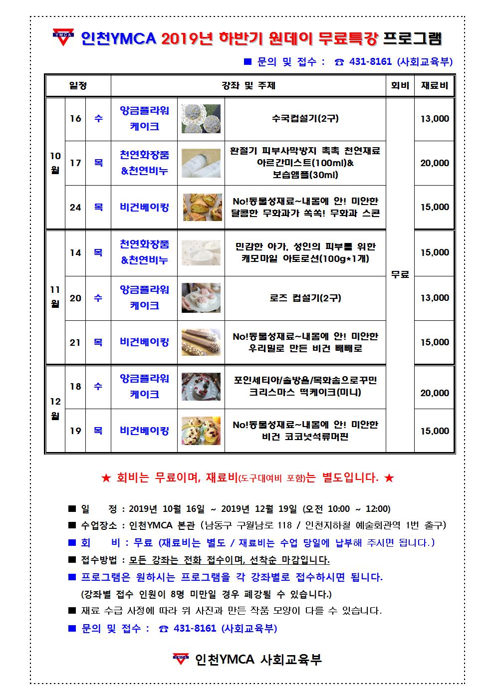<인천 YMCA 2019 하반기 원데이 무료특강 프로그램 안내>