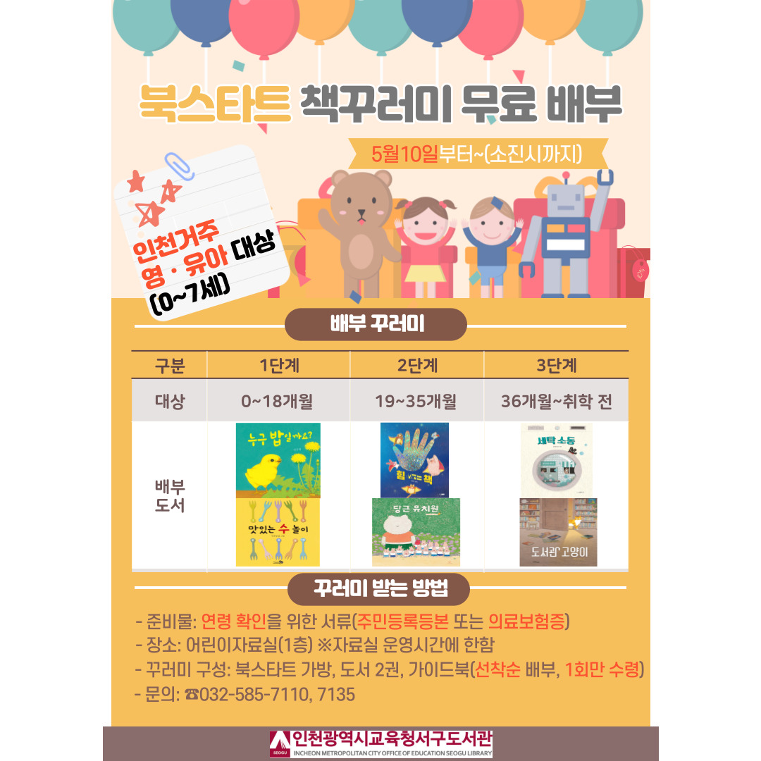 서구도서관 어린이자료실에서는 인천 거주 영,유아를 대상으로 '북스타트' 책꾸러미를 무료로 배부합니다.