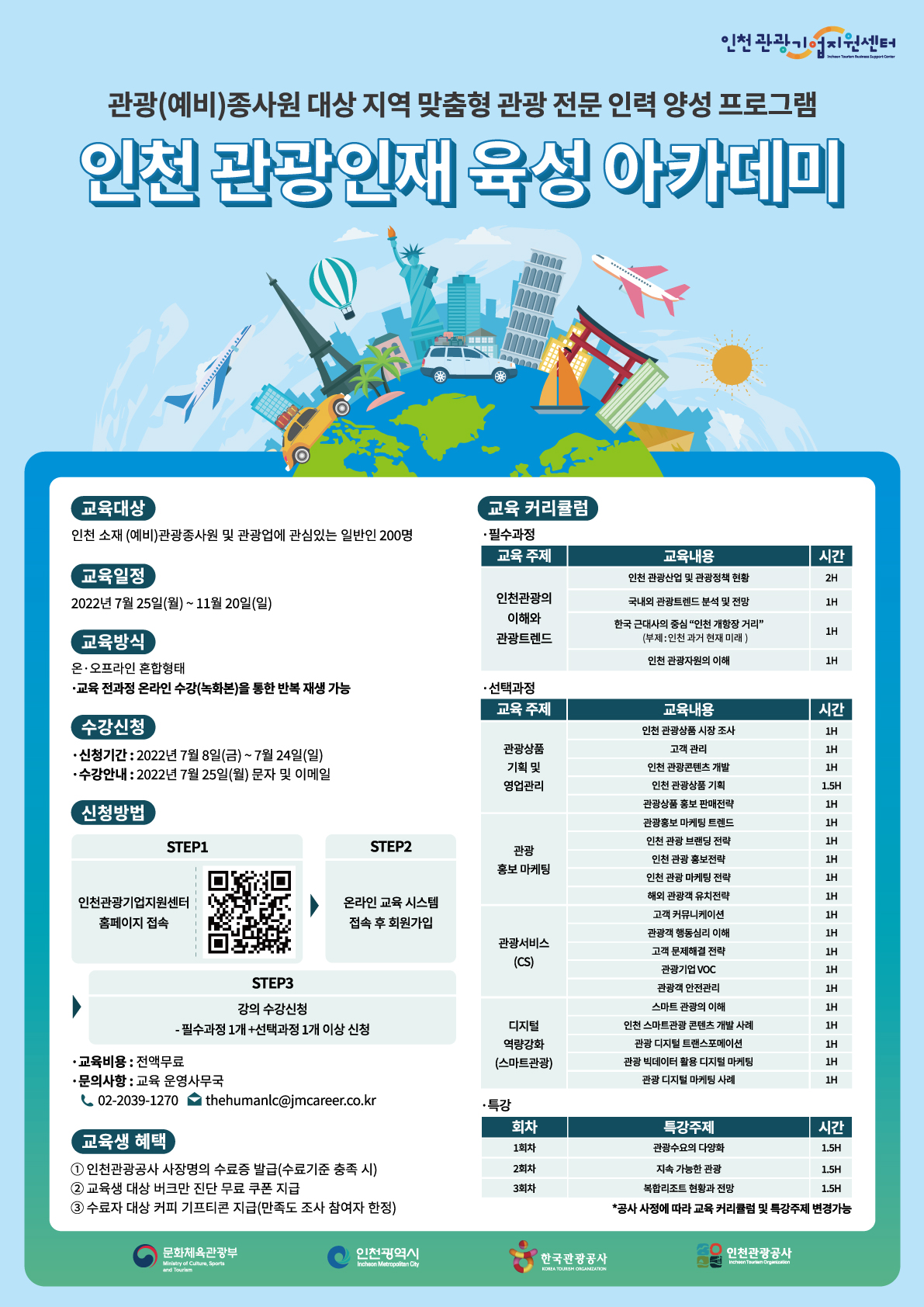 ✔신청방법 : 인천관광기업지원센터 공지사항 접속 > 온라인 교육 시스템 접속 후 가입 > 수강신청 (필수과정 1개+선택과정 1개 이상)
