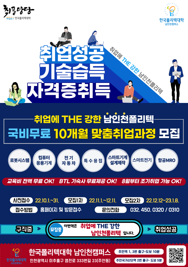 취업에 더 강한 남인천폴리텍에서는, 전문기술 국비무료 10개월 과정 신입생을 모집하고 있습니다