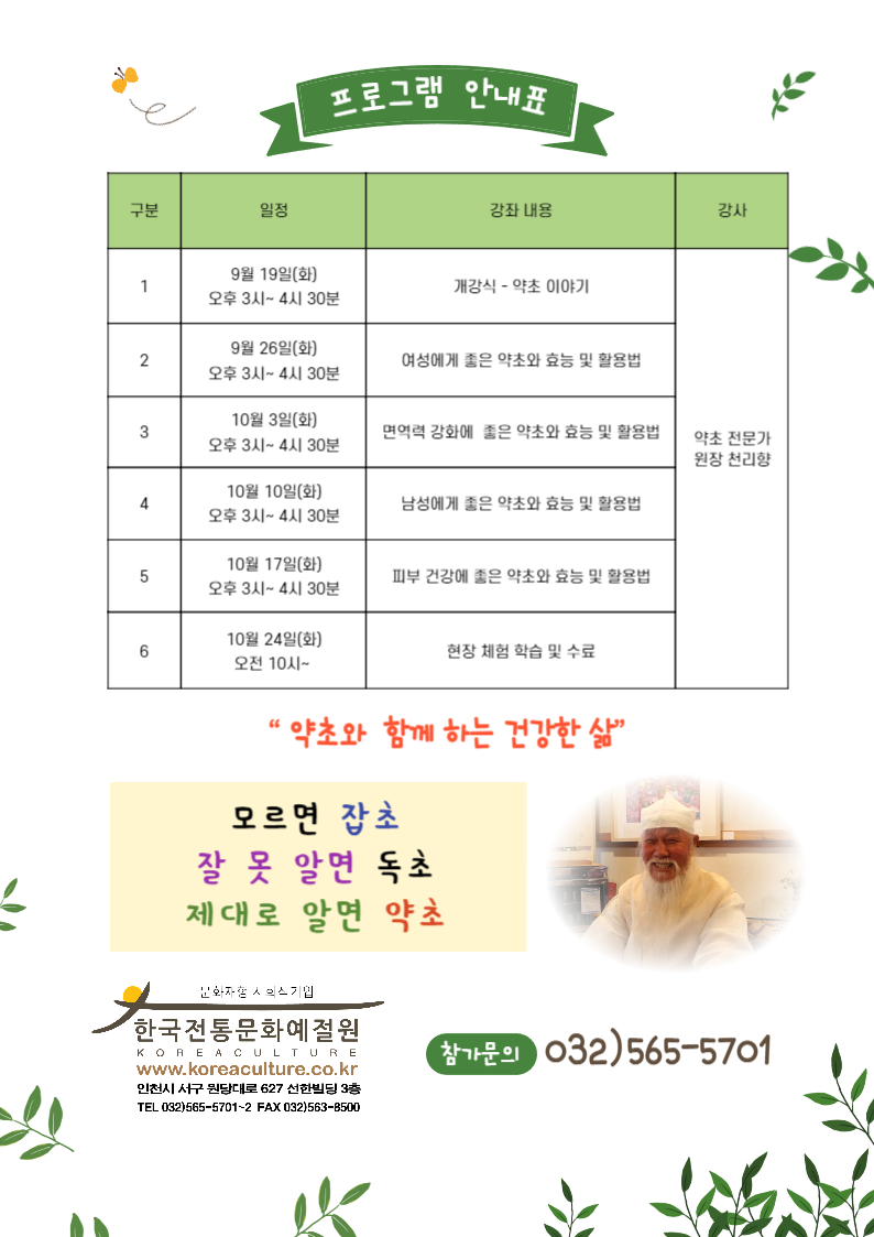 약초의 향기와 힘을 느껴보세요. 건강과 웰빙을 추구하는 분들을 위한 완벽한 기회입니다.